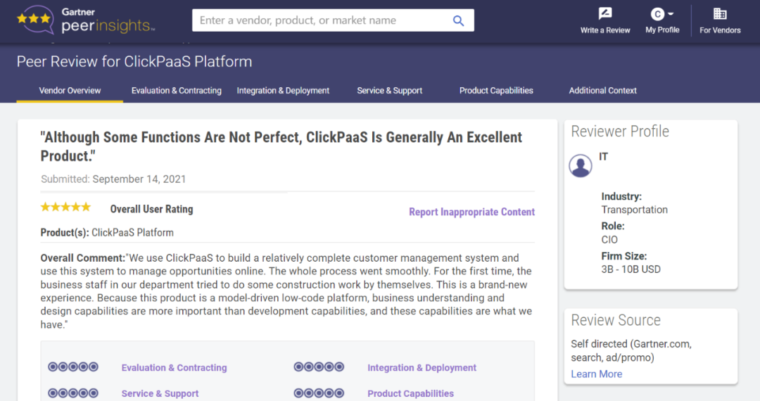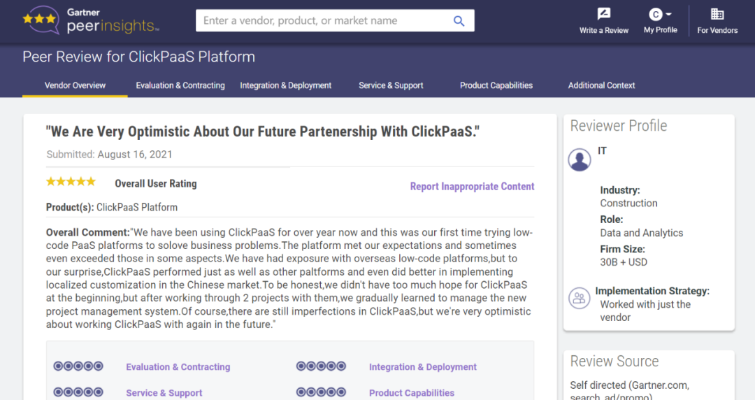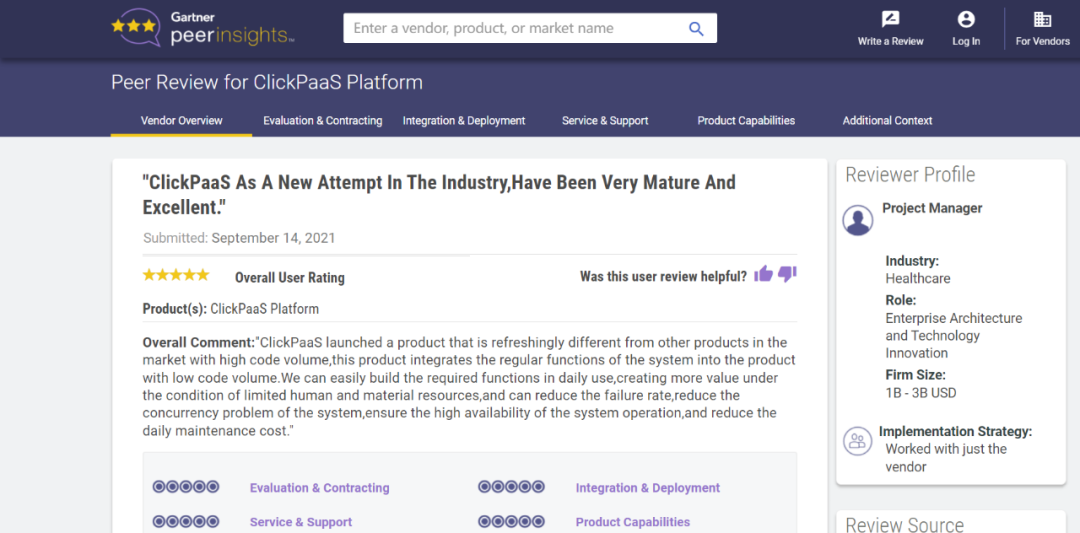 Tips:::::::::::【Peer Insights】——用户对企业IT产品和服务发布真实评价的平台。。。。。。。。。目前已有355个市场,,,,,,,,,,,,255,000条经过验证的评价。。。。。。。。。每一条评价Gartner会针对参评企业营收规模及参评人员信息做验证、、、、、、、、、、评价内容做多维核实。。。。。。。。